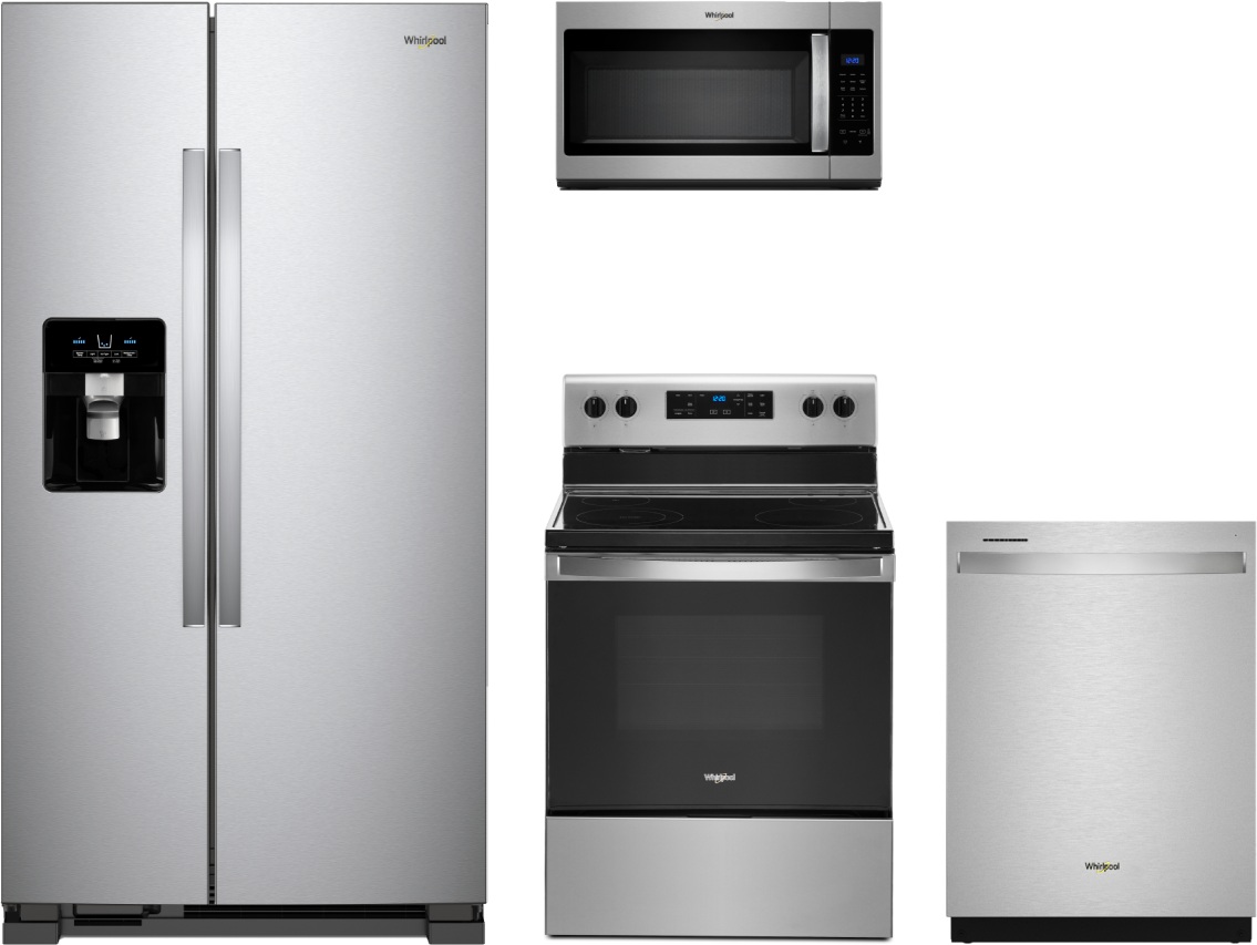 Whirlpool® 4 Piece Kitchen Package-Stainless Steel with a side-by-side refrigerator, free standing electric range, built in dishwasher and over the range microwaveRead More