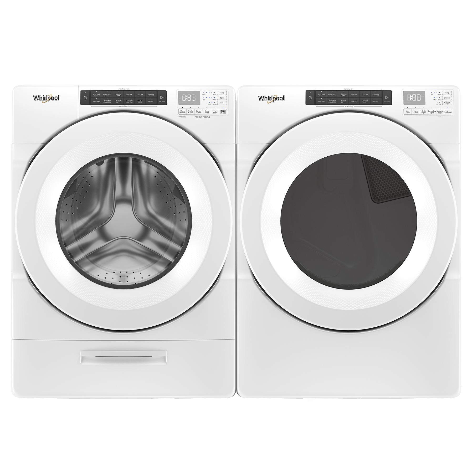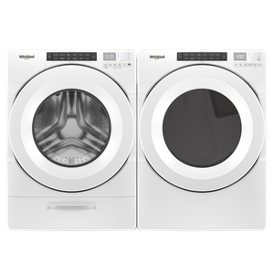 Whirlpool® White Front Load Laundry Pair with a 4.5 cu. ft. capacity front load washer and a 7.4 cu. ft. capacity front load electric dryer.Read More